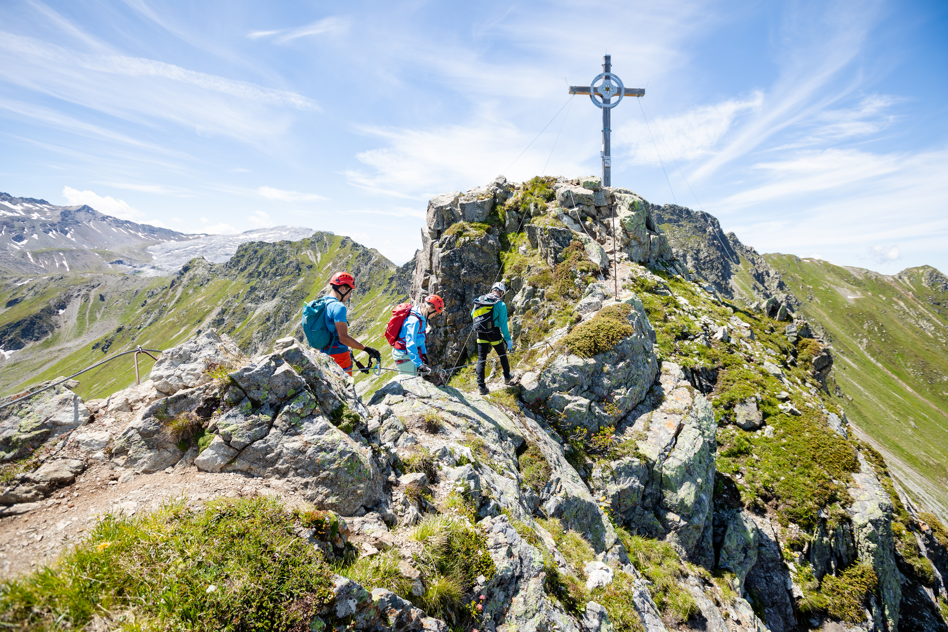 Abstieg: Direkt vom Gipfelkreuz führt eine drahtseilgesicherte Wandstufe abwärts auf den flacher werdenden Grat. Nach dem Ende der Drahtseile ist Trittsicherheit gefragt: Über einen steilen Schotterpfad führt Dich der Weg bis zu den Lawinenverbauungen oberhalb der Bergstation des Sessellifts. Von dort gelangst Du in ca. 15 Minuten auf einem Fahrweg bis zur Bergstation der Bergbahnen Gargellen.