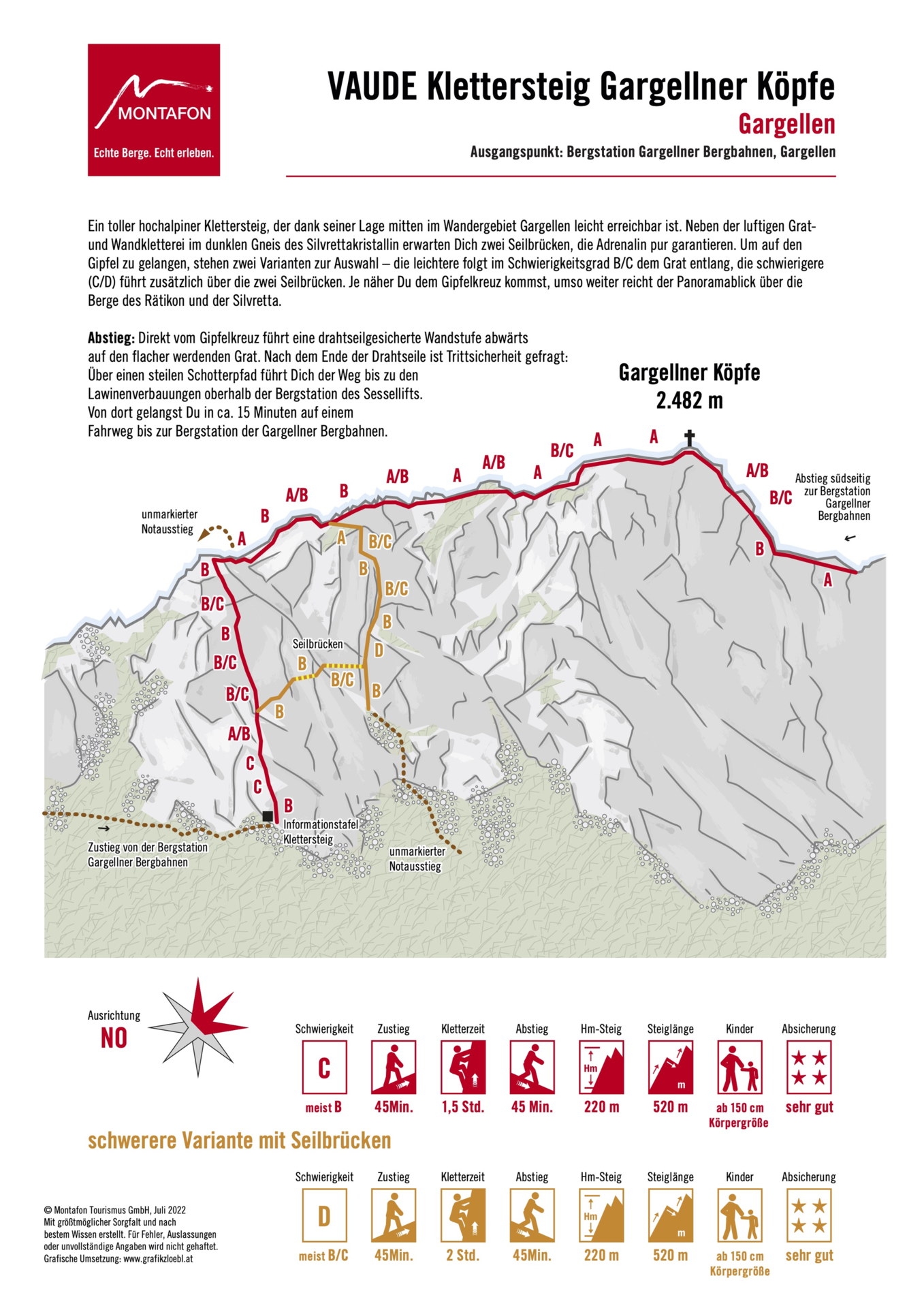 Zustieg: Von der Bergstation der Gargellner Bergbahnen folgst Du der Beschilderung Richtung St. Antönier Joch bis zur Bergstation der Kristallbahn. Von dort führt nach links ein Pfad dem Grat entlang bis zu einer Scharte. Anschließend geht es leicht nach rechts durch den Hang bis zum Einstieg.
