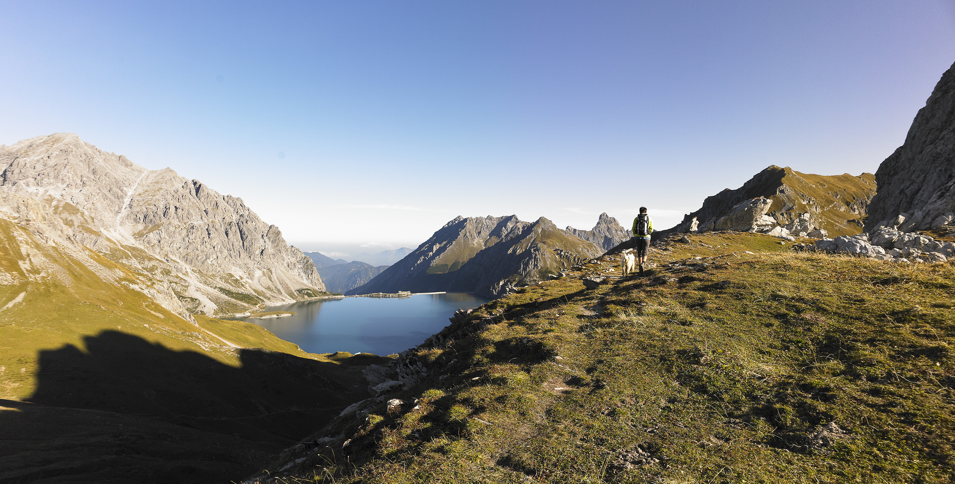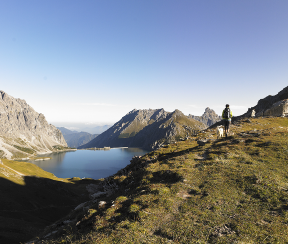Die Etappe startet auf der Staumauer und Du umkreist der restlichen Teil des Lünersee. Wieder vorbei an der Alpe Lünersee führt dich der Weg hinauf zum Gafalljoch (2.239 m). Herzlich Willkommen in der Schweiz. In weiter Ferne kannst du bereits von hier die Carschinahütte sehen.