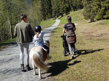 für die größeren Kinder bieten wir Spaziergänge im Gelände oder die ersten Reitstunden auf unserem Reitplatz mit unserer Ponystute Amrei an.